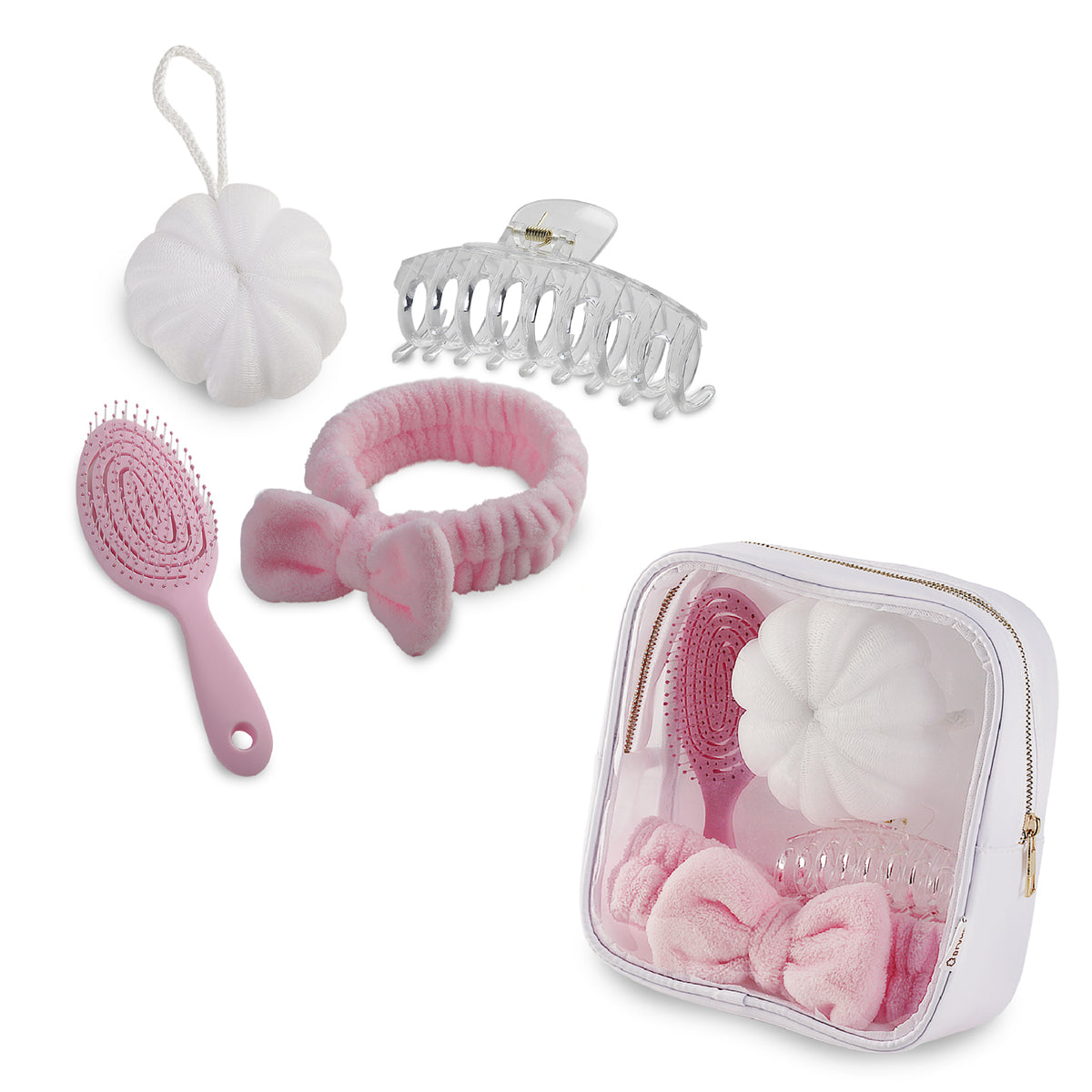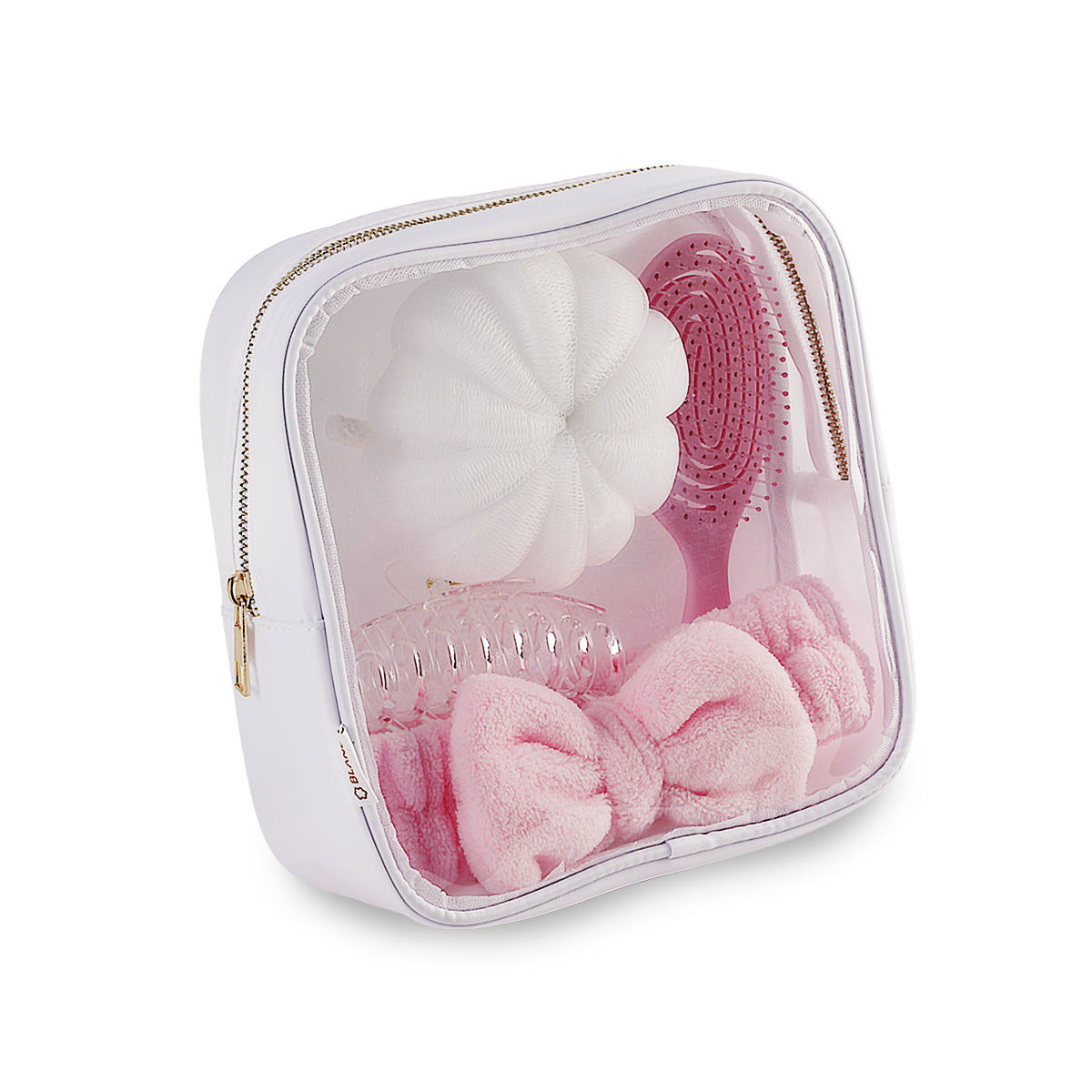 מארז טיפוח פרקטי ומעוצב הכולל תיק איפור שקוף מחומר PVS עם חזית נוחה לצפייה מהירה בתכולה. המארז כולל סרט מצח עם פפיון לשיער, מברשת שיער איכותית, קליפס חזק במיוחד וספוג רחצה – כל מה שצריך לשגרת טיפוח יומיומית. מידות התיק נוחות ומאפשרות שילוב של מוצרי קוסמטיקה נוספים בהתאם לצורך, לשימוש בבית או בדרכים. העיצוב השקוף מוסיף נוחות, סדר ונגישות, תוך שמירה על מראה מודרני ואסתטי. המוצר מתאים במיוחד לנסיעות, חדר כושר, משרד או כסט אישי שימושי. פתרון מצוין כמתנה לוועדי עובדים, חברות ומוצרי פרסום וקד״מ, עם ערך שימושי גבוה וחשיפה יומיומית. נארז בקרטון של 20 יחידות, מתאים להפצה רחבה ואפקטיבית.