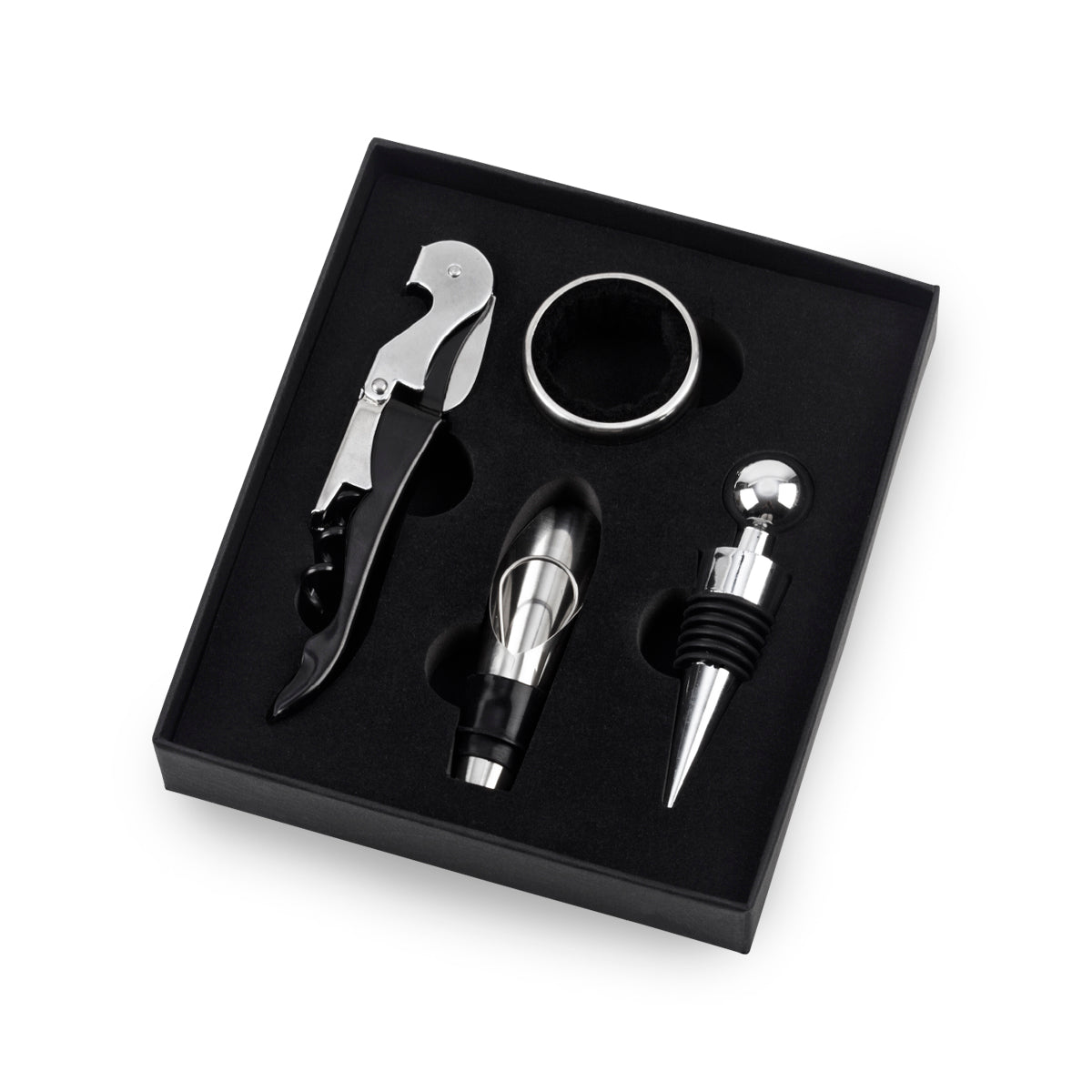 סט אביזרים ליין מקצועי המגיע באריזת מתנה אלגנטית, הכולל פותחן מלצרים, משפך מזיגה עם פקק, טבעת למניעת טפטוף ופקק מעוצב. פתרון מושלם למתנה עסקית או מוצר קד"מ שמדגיש סטייל ואיכות. כמות יחידות בקרטון: 60. אידיאלי לוועדי עובדים, חברות ומוצרי פרסום.